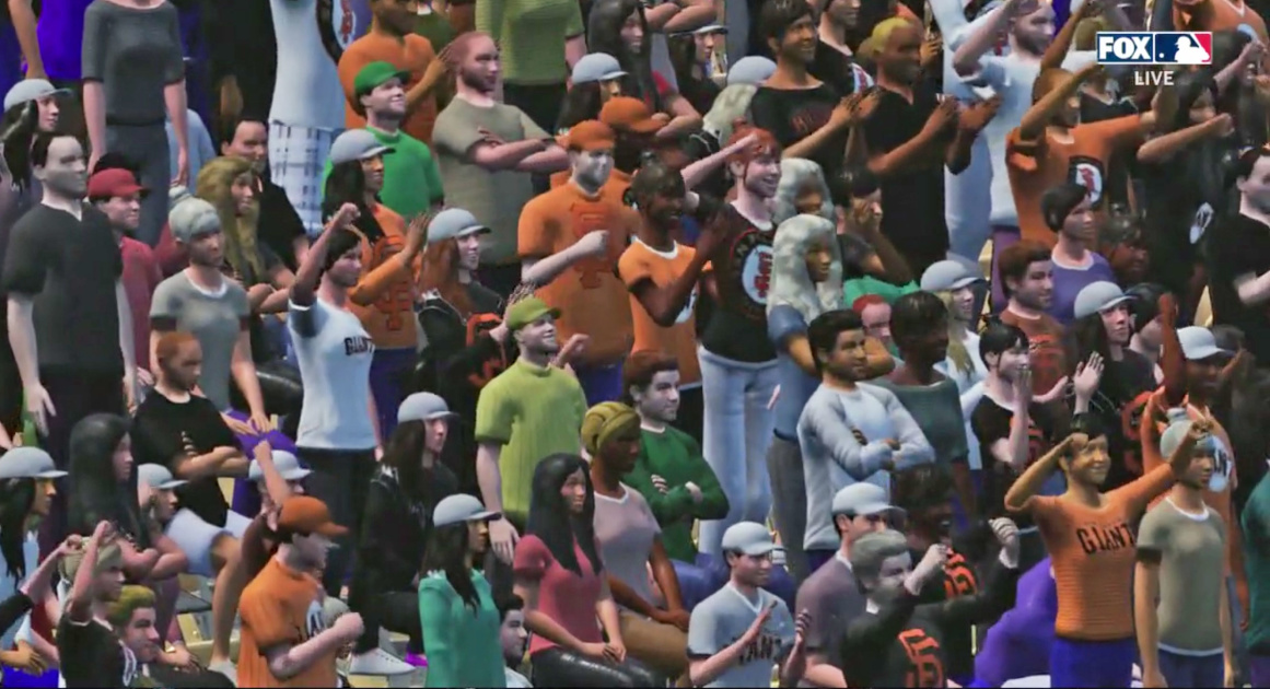 And, of course, there’s the fact that none of the fans were doing what most fans would do at a baseball game. No one was drinking a beer, no one was eating a hot dog, no one was holding up cardboard signs and no one was wearing a garish homemade costume. In one amusing instance, Fox Sports producers had both Dodgers and Giants fans do the wave, and as several fans on Twitter pointed out, well, Giants fans just don’t do that (call it a longstanding/sitting tradition). Perhaps the most realistic thing that the virtual crowd did was that it started to thin out towards the later innings, much like real-life Dodgers fans would do in order to beat LA traffic.