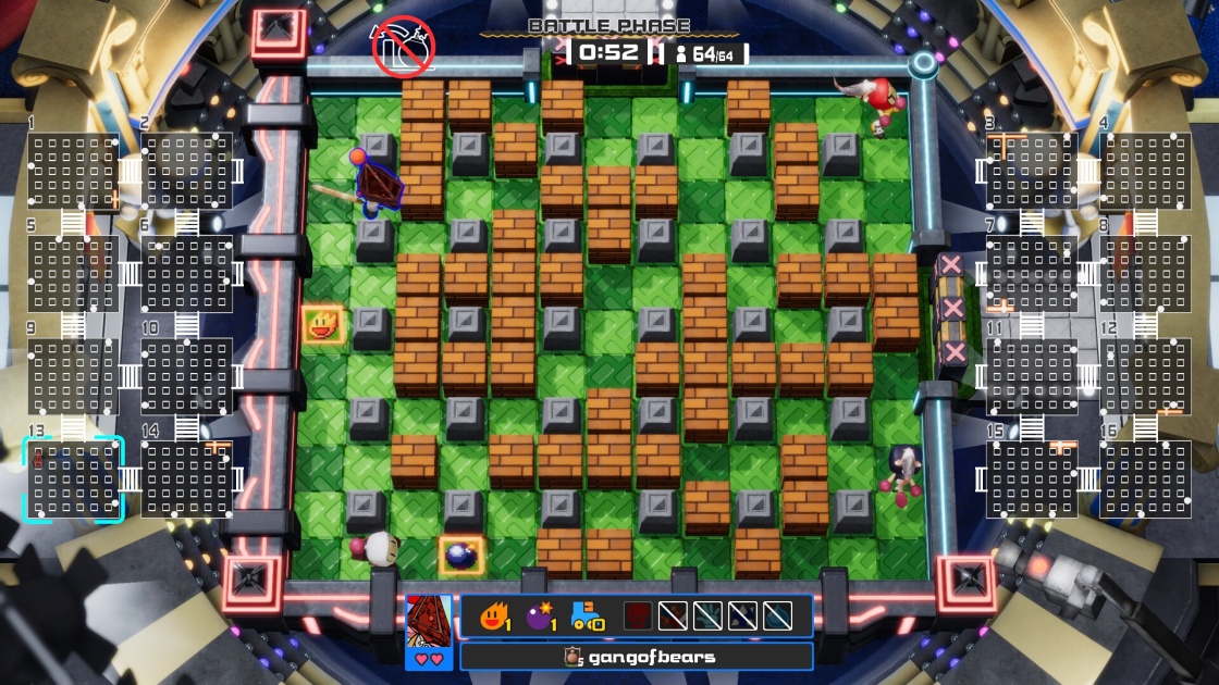 The game’s complexity increases when you consider the various Bomberman characters. The base game comes with eight basic Bombers — White, Black, Blue, Pink and so forth — that have slightly different attributes. Black starts with level five movement speed, for instance, that can be upgraded mid-match to level eight. He can only lay a single bomb at the start of the game, though, and his maximum bomb-laying capacity is two. Red, meanwhile, starts at fire level five and can reach level eight by picking up fireball items throughout the game. On the flip-side, his movement speed starts at zero and tops out at two.